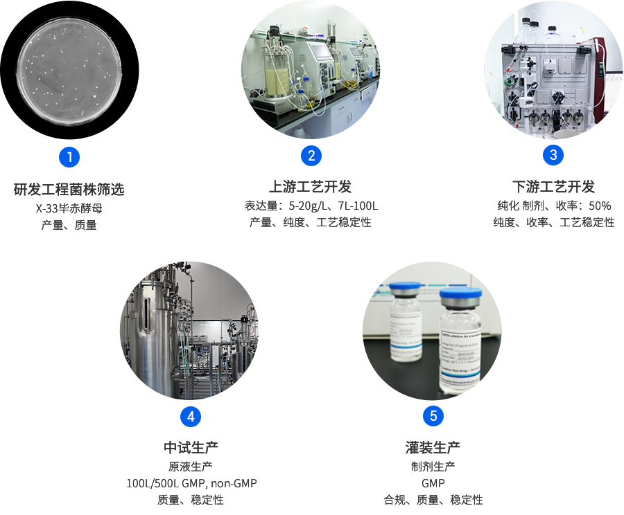 九州酷游官网生物已成功建立毕赤酵母CMC平台,现在已具备多个完整项目开发经验。毕赤酵母CMC平台90%以上的项目产量在1g/L以上,纯化平台工艺,其整体回收率在50%以上。从细胞株构建到蛋白纯化仅需3-4个月,极大地缩短了项目开发时间。